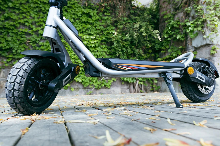 Sleek integrated silver design with cyber-inspired flair. 800W motor, 45km/h speed, and long-lasting battery conquer all roads. Rubber shock absorption, one-click fold, and full-light safety. Trendy, durable, your perfect urban companion.