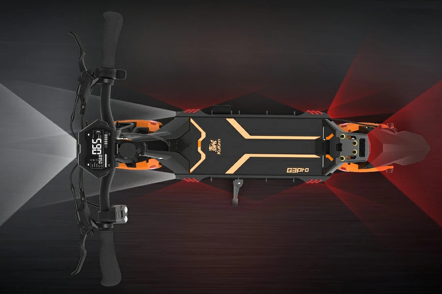 The KuKirin G3 Pro features 6 LED lights—including headlights, turn signals, and brake lights—for clear nighttime visibility and safety, with flashing alerts for turns and braking.